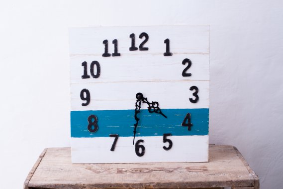Sistema il primo listello appoggiandolo a questa guida, distribuisci un po' di Pattex Tutto Con Uno sul bordo del secondo listello ed incollalo al primo, facendo un po' di pressione. Elimina l'eventuale eccesso di colla. Incolla nello stesso modo tutti i listelli, lasciando al centro quello con il buco. Incolla con Pattex Tutto Con Uno i due listelli più stretti, in senso perpendicolare, a qualche cm dal bordo. Lascia asciugare 24 ore. Gira l'orologio e, con il taglierino, elimina eventuali eccessi di colla e scartavetra leggermente. Dipingi i numeri e l'orologio con i colori che hai scelto e che si abbinano meglio al tuo arredamento, lascia asciugare e scartavetra seguendo la direzione delle venature del legno, per dare un effetto “consumato”.