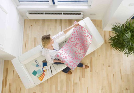 Per prima cosa, taglia i tre fogli di gommapiuma delle dimensioni della tavola di legno e stendili su di essa. Ora ricoprili con il tessuto, ben teso, che fisserai alla parte sottostante della tavola con una sparapunti. Il coperchio del tuo pouf contenitore è già pronto!