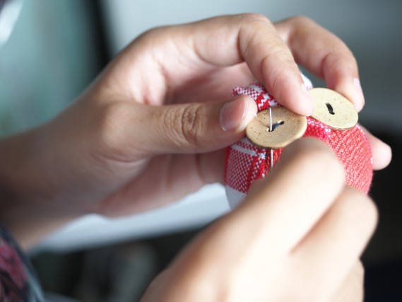 Ritagliare la stoffa colorata circolare con un diametro 16 cm aiutandoci con un piattino, poi infilare l’ago con filo da ricamo su tutto il bordo del cerchio, e infine tirare lo stesso filo. Prima di chiudere quello che sarà il corpo della dollina inserire del riso, stringere bene e dare un paio di punti per chiudere bene il bordo.