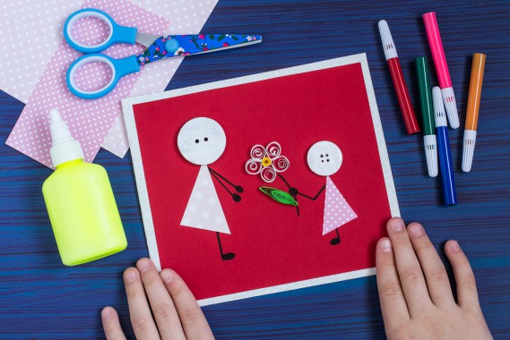 Un’altra idea è ricoprire il cartoncino con un tessuto fantasia o tinta unita da decorare con i bottoni scegliendo il tema più adatto per l’occasione. Una variazione é ritagliare le stoffine per realizzare i vestitini alla mamma e al bambino o bambina che andremo ad incollare sul biglietto. Possiamo anche variare la tecnica e aggiungere dei dettagli in quilling arrotolando e arricciando striscioline di carta.