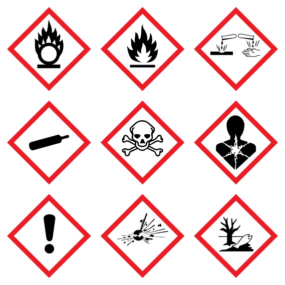 Sulle etichette, possiamo vedere i pittogrammi di pericolo ovvero i diamanti, i rombi con il bordo rosso al cui interno ci sono dei disegni, che richiamano il possibile pericolo di un prodotto, come stabilito dal regolamento europeo CLP. Prima, invece, i simboli erano quadrati e di colore arancione.