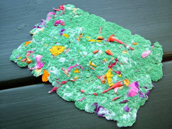 Inserire nella ciotola la cornice e distribuire uniformemente la polpa di carta. Poi aggiungere i petali, sollevare il telaio e lasciarlo scolare, quindi sistemare un panno sopra e uno sotto il telaio. Premere con decisione per eliminare acqua e umidità. Rovesciare il telaio e lasciare asciugare per una notte, meglio all’aria aperta.