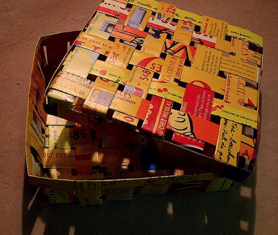 Oppure puoi ritagliare delle strisce di rivista, piegarle a metà secondo la lunghezza, in maniera che siano più resistenti, e intrecciarle come per creare un cestino in vimini.
