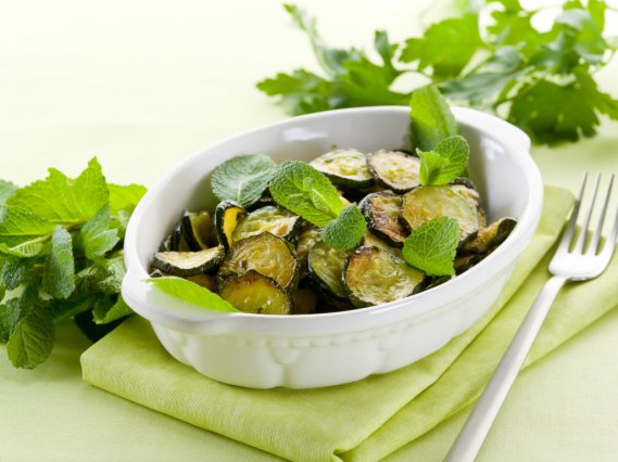 Prima di dedicarci alle zucchine, prepariamo il battuto per la marinata, tritando insieme la menta con il prezzemolo e l'aglio. Mettiamo da parte in una ciotola per far sì che i sapori si amalgamino. Ora laviamo le zucchine ed epuriamole delle estremità, poi tagliamole per lungo. Possiamo anche farle a rondelle, ma se vogliamo seguire la ricetta giudaica alla lettera, dobbiamo tagliarle per orizzontale ad uno spessore di 3-5 millimetri.