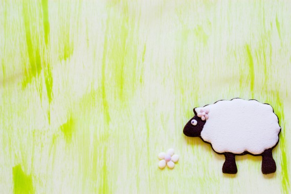 - Usare la glassa per realizzare la testa e le orecchie nere della pecora, a coprire due petali sulla sinistra