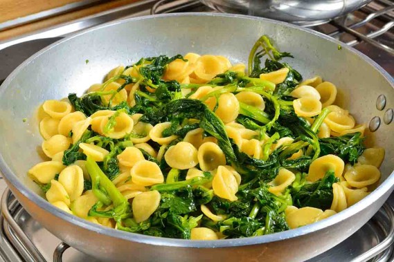 Prepariamo il condimento pulendo le cime di rapa con cura: togliamo le foglie esterne e prendiamo solo il fiore e la parte interna. Quando sono pronte, sciacquiamo le cime di rapa, scoliamole e asciughiamole con cura.