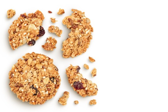 Preriscalda il forno a 180 gradi e rivesti una teglia con carta da forno. In una ciotola media, unisci il burro di anacardi, il burro di mandorle e lo sciroppo d'acero e mescola fino a ottenere un composto omogeneo e ben combinato. Aggiungi bicarbonato di sodio, sale e zucchero di cocco e mescola. Quindi aggiungi i fiocchi d'avena, i semi di chia, le noci tritate e la frutta secca nella ciotola. Mescolare bene per distribuire uniformemente gli ingredienti.