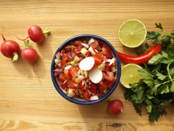 Mettere in una ciotolina o in scodellina e aggiungere sale e pepe a piacere. Se i peperoncini rendono la salsa troppo piccante, aggiungere altro pomodoro tritato. Se non è abbastanza piccante, aggiungere con attenzione alcuni semi dei peperoncini o un po' di cumino macinato in più.