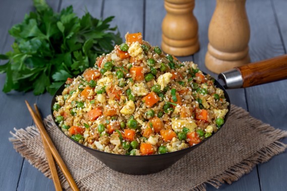 Il riso di cavolfiore si può davvero preparare velocemente. Metti la testa, tagliata a pezzi ma ancora cruda, in un mixer da cucina oppure usa una grattugia. Il prodotto finale dovrebbe assomigliare a piccoli chicchi di riso.