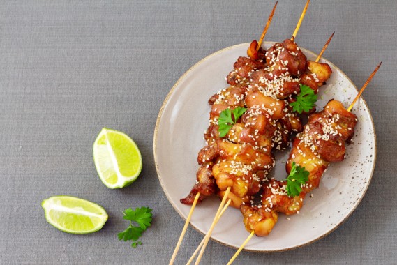 Metti gli spiedini di pollo sulla griglia e falli cuocere per 2 minuti per lato. Quindi spennella metà della glassa sugli spiedini e griglia altri 3 minuti. Capovolgi gli spiedini un'ultima volta e glassa di nuovo. Griglia per altri 3 minuti. Tolti dalla piastra, devi cospargerli con semi di sesamo. Servili caldo.