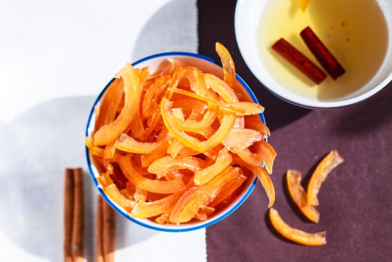 Porta a ebollizione la buccia, tutto zucchero e 150 ml di acqua nella stessa pentola; abbassa la fiamma e lascia sobbollire finché la buccia non diventa traslucida, 15-20 minuti. Scola; trasferisci la buccia su una griglia e lasciala asciugare, 2-4 ore. Aggiungi altro zucchero.