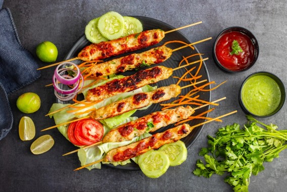 Disporre gli spiedini su griglie unte e grigliare, senza coperchio, girando di tanto in tanto, finché non sono dorati e cotti bene anche dentro, 12-14 minuti, irrorando spesso con il composto di burro. Trasferire gli spiedini su un piatto da portata. Servire con yogurt aggiuntivo, spicchi di limone ed erbe fresche.