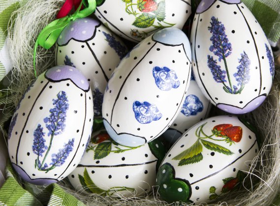 Una grande candela decorata a découpage e circondata da tanti petali di rosa in stoffa. Il tocco ideale è la coppa in vetro, una cornice perfetta per il centrotavola pasquale.