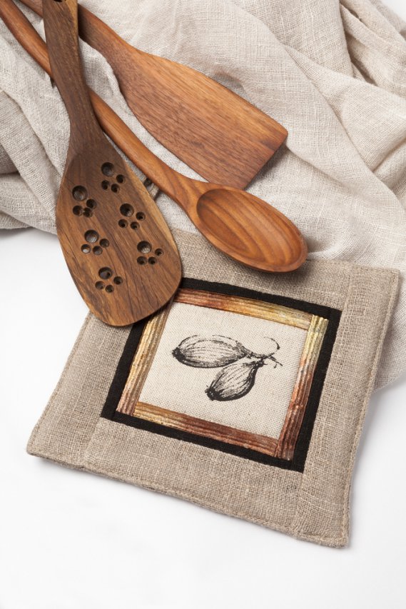 5 - Se desideri puoi anche applicare due manici di stoffa sui due lati opposti. Un suggerimento anche per la miscela da inserire all’interno del sottopentola: mirtillo, corteccia di cedro, alloro e cannella.
