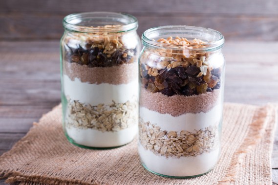 Basta organizzare il preparato per biscotti in un barattolo pulito e sterilizzato, sistemandolo in strati ben compatti e, all'esterno, fissare un biglietto in cui scrivere quali ingredienti liquidi aggiungere all’impasto (in questo caso, 80ml di latte e 60ml di olio di semi di girasole).