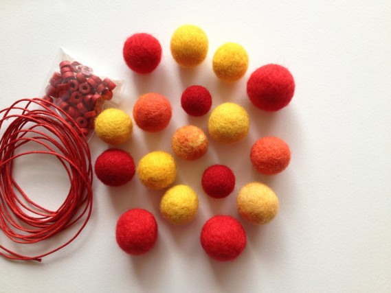 Base di gomma piuma, ago da rammendo, palline di feltro, filo di nylon, seta o cordoncino, forbici, schiaccini, perline di plastica (opzionale), fermaglio a moschettone, pinza piatta