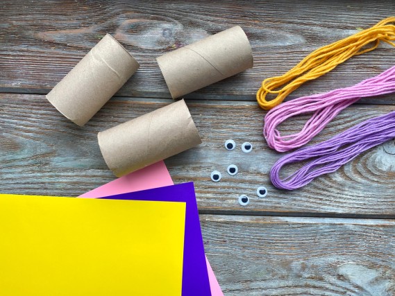 Cartoncini colorati (giallo, arancione, bianco, rosso, rosa, verde, celeste), tubi carta igienica e tempere (facoltativi)), forbici, colla stick Pritt, occhi mobi (o pennarello nero), spillatrice, spago, filato di lana