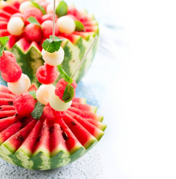 Rendere appetitosi anguria e melone non è difficile. La coppa è l’esterno stesso del melone, ben scavato con gli appositi strumenti, al quale avrete smussato il fondo per poterlo appoggiare sul piatto; al suo interno tante palline di melone e tocchetti di anguria. Per completare il piatto, vi consigliamo di sminuzzare grossolanamente i pistacchi e disporli sul tutto con una julienne di melone.