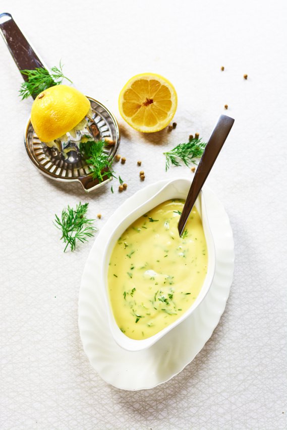 2 – Aggiungi un tuorlo, lavora il tutto con la frusta e tieni il recipiente a bagnomaria. Aggiungi il burro fuso a filo e l’altro tuorlo, continuando sempre a mescolare. Trasferisci la crema che avrai ottenuto in una terrina e aggiusta con il sale e il succo di limone.