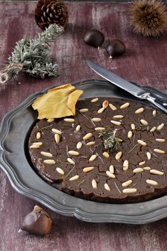 In una tazza abbondante d'acqua calda, poni l'uva passita in ammollo. In una zuppiera, metti i 300 gr di farina setacciandoli preventivamente. Aggiungi la presa di sale e piano piano, mescolando con una frusta, l'acqua fredda in modo che si crei un composto abbastanza liquido e senza grumi e lascia riposare per mezz'ora. Fai soffriggere per un minuto 3 cucchiai d'olio d'oliva insieme al rametto di rosmarino, in modo da ottenere un olio leggermente aromatizzato che verserai sul fondo di una teglia piuttosto bassa con il rosmarino stesso. Aggiungi a questo punto tutti gli ingredienti avendo cura di sparpagliarli sul fondo della teglia. Versa il composto di farina di castagne nella teglia, aggiungi altri 3 cucchiai d'olio cercando di irrorare tutto il dolce ed inforna per 30 o 40 minuti in forno a 220°C.