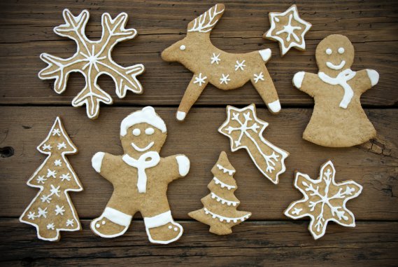 Mettete nella ciotola dell'impastatrice la farina, il miele, lo zucchero semolato, il burro morbido, i tuorli, un cucchiaino di lievito, 3 cucchiaini di zenzero in polvere e 3 di cacao. Avviare l'apparecchio con la frusta a gancio aggiungendo il latte, poco per volta, per ottenere un impasto elastico e non troppo sodo. Lasciate riposare la pasta per 30 minuti, poi stendetela a 1/2 cm di spessore e tagliatela con gli appositi tagliapasta a forma di albero, angelo e cuore. Con uno spiedino di legno praticate in ogni biscotto un foro per passarvi il nastro, quindi sistemateli su placche coperte da carta forno e infornateli a 175° per 15 minuti circa. Sfornateli e lasciateli raffreddare. Per la glassa, lavorate 2 cucchiaiate di albume con tanto zucchero a velo quanto sarà necessario per ottenere un composto molto denso al quale vanno aggiunte poche gocce di succo di limone. Guarnite i biscotti con un filo di glassa e con codine di zucchero colorato, confettini argentati e altre guarnizioni; al momento di appenderli, passate il nastrino nel forellino.