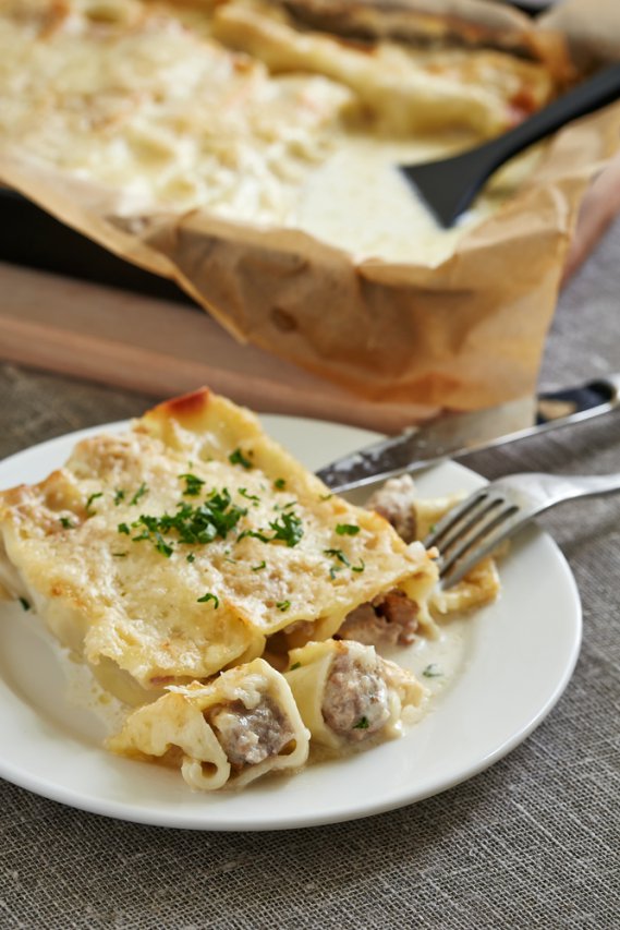 Per preparare il ripieno dei cannelloni, fai rosolare la carne macinata con olio e odori, poi impastala con le uova, il pecorino, la noce moscata.