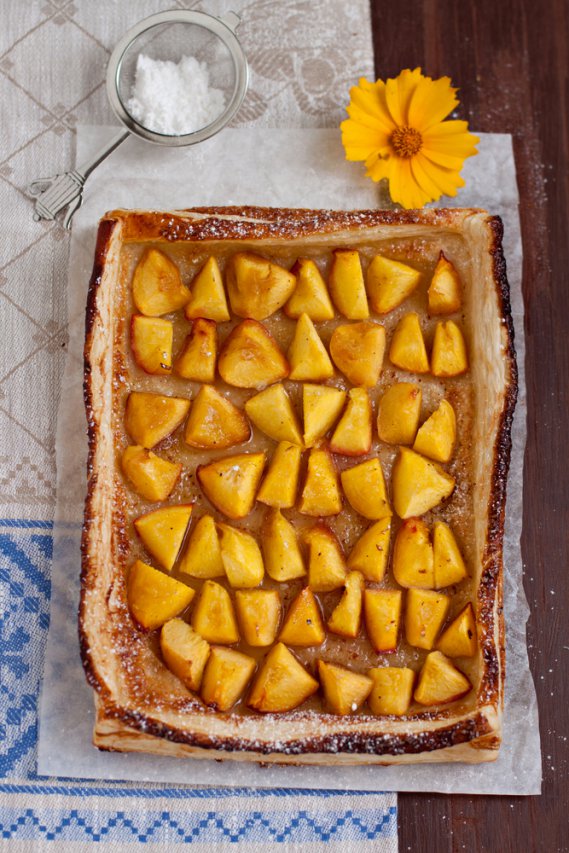 per preparare una rapidissima crostata di pesche e mandorle, sbuccia le pesche e tagliale a spicchi. Sbriciola gli amaretti. Imburra e infarina una teglia da 20 cm per crostate e foderala con il disco di pasta frolla. Con una forchetta, fai dei buchi sul fondo della pasta frolla e ritaglia la pasta che esce dal bordo. Distribuisci gli amaretti sbriciolati sul fondo della pasta, sistemaci sopra gli spicchi di pesca in modo da coprire gli amaretti e spolverizza con le mandorle tritate. Con gli avanzi di pasta crea delle strisce per formare una rete sulla crostata. Spennella le strisce con il latte e cospargile di zucchero. Ripiega all'interno il bordo della pasta facendolo aderire alle strisce e, con il pennello da cucina, bagnalo leggermente con un po' di latte. Inforna in forno già caldo a 180°C per circa 40 minuti, fino a quando la crostata si sarà dorata nel modo giusto.