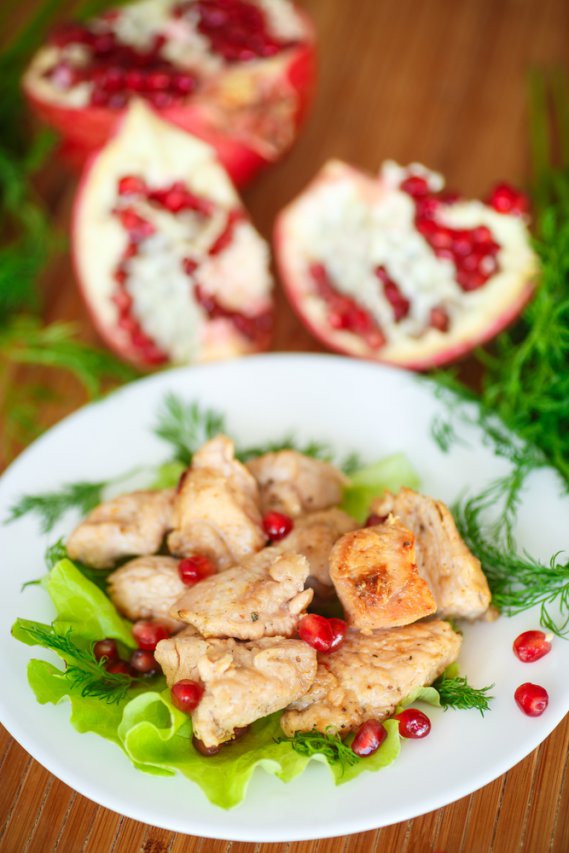 Scotta, imbiondisci e sala in padella i petti di faraona con un po' d'olio. Quando la faraona avrà preso un bel colore biondo, aggiungi la cipolla tritata finemente e falla rosolare a fuoco vivace. Prendi i melograni, sbucciali e uniscili ai petti di faraona. Il tutto deve cuocere a fuoco moderato per 10 minuti. Spruzza quindi con del vino rosso e aggiungi il brodo. Continue la cottura finchè il brodo sarà tutto evaporato. Servi ben caldo.