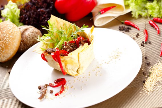 Svuota quattro piccole pagnotte o prepara dei cestini con la pasta sfoglia. Taglia i peperoni, puliscili dai semi e tagliali a fettine; affetta sottilissima anche la cipolla e metti le verdure a saltare in una padella con olio d'oliva per 5 minuti. Aggiungi la carne tagliata a listarelle e salta a fuoco vivo per qualche minuto ancora. Regola di sale e servi subito, distribuendo verdure e carne nei quattro cestini. Guarnisci con qualche fogliolina di rucola.