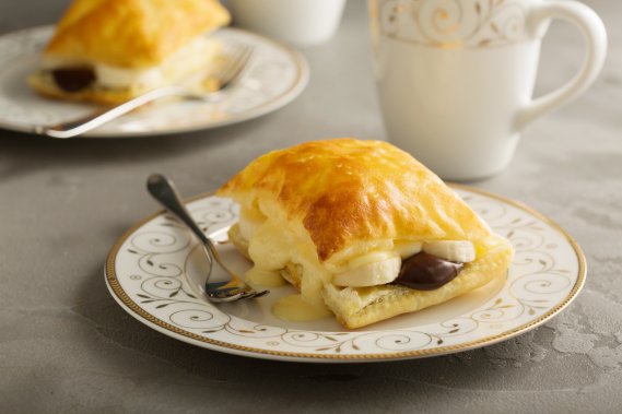 Sbucciate le banane, tagliatele a rondelle e spruzzatele con il succo del limone affinché non anneriscano. mettetele a macerare con il rhum e una spolverata di zucchero semolato. tagliate la pasta sfoglia in modo da ricavare 3 rettangoli uguali. bucate la superficie con i rebbi di una forchetta e cuocete in forno a 200° per circa 15 minuti. sfornate, spolverizzate la pasta sfoglia con lo zucchero a velo, infornate nuovamente sino a quando la superficie apparirà dorata. sfornate e lasciate raffreddare. sbattete i tuorli con gr. 70 di zucchero, unite la farina ed il latte che avrete precedentemente portato ad ebollizione. mescolate e fate bollire per circa 8 minuti in modo da ottenere una crema. lasciate raffreddare ed aggiungete le rondelle di banana scolate dal liquido. posizionate un primo rettangolo di sfoglia sul piatto di portata e distribuite una parte della crema alle banane. ricoprite con un secondo strato di pasta sfoglia. aggiungete ancora crema e terminate con la sfoglia. montate la panna e con un sac à poche decorate la superficie della sfoglia. completate con il cocco grattugiato e servite.