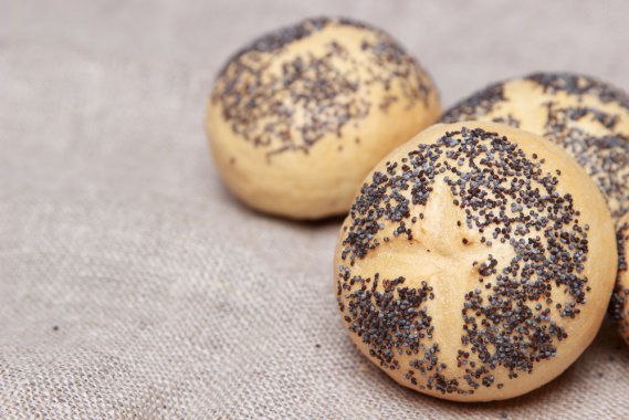Setaccia la farina. Sciogli il lievito in 30 g di latte leggermente intiepidito, a cui avrai aggiunto lo zucchero. Dopo 10 minuti, unisci la farina rimasta ed amalgama il tutto in modo da formare un composto uniforme. Copri con pellicola da cucina e lascia riposare per circa 30 minuti. Mescola 3 uova intere più il tuorlo con il latte rimasto e versa il tutto sull'impasto lievitato. Lavora l'impasto nell'impastatrice con un pizzico di sale. Quando il tutto si sarà ben amalgamato, aggiungi il burro e prosegui ad impastare sino a completo assorbimento del burro. Fai lievitare in luogo tiepido ed asciutto sino la raddoppio del volume. Riprendi nuovamente l'impasto e ricava delle piccole palline che metterai man mano sopra una teglia ricoperta di carta da forno. Spolverizza i panini con i semi di papavero e spruzzali con poca acqua. Copri con un canovaccio pulito e fai lievitare per altri 25 minuti. Inforna i panini a 180°C per circa 20 minuti. Sforna e lascia raffreddare. Lava e trita la rucola, mescola il formaggio fresco di capra con un filo di olio extravergine d'oliva e un po' di pepe nero. Taglia i panini a metà e farciscili con un po' di formaggio, il prosciutto cotto e la rucola. richiudili e disponili man mano sul piatto di portata.