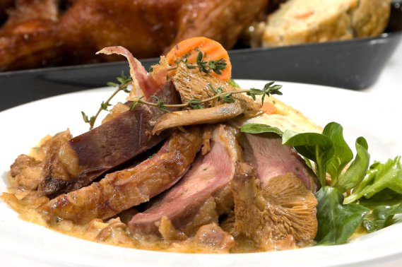 Lava, pulisci e asciuga il petto d'anatra. Pulire accuratamente i funghi con un pennello o un telo inumidito, lasciando i piccoli interi e tagliando i più grandi a metà. Sbuccia gli scalogni e tagliali a spicchi. Pulisci e monda le erbette. In una padella capiente, insaporisci l'olio con l'aglio in camicia (con la buccia). Togli l'aglio, fai rosolare il petto d'anatra per 4 minuti da ciascun lato. Sala, pepa e irrora con il sidro. Togli la carne dalla padella e lasciala nel forno a 50°C. Salta i funghi e gli scalogni con le foglioline di timo e tieni in caldo insieme al petto d'anatra. Sbollenta le erbette in acqua salata, scolale e falle insaporire nel sugo dell'anatra. Taglia la carne a fette spesse circa 1,5 cm. e servila accompagnata da scalogni, funghi ed erbette, il sugo e una generosa cucchiaiata di marmellata di mele e rabarbaro.