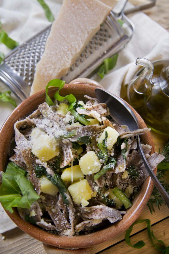 Mescola le 2 farine, impastale con acqua (aggiungine poca per volta per ottenere un impasto piuttosto duro) e lavora per circa 5 minuti. Con il mattarello tira la sfoglia fino ad uno spessore di 2-3 millimetri dalla quale si ricavano delle fasce di 7-8 centimetri. Sovrapponi le fasce e tagliale nel senso della larghezza, ottenendo delle tagliatelle larghe circa 5 millimetri. Cuocei le verdure in acqua salata, le verze a piccoli pezzi e le patate a tocchetti, unisci i pizzoccheri dopo 5 minuti. Dopo 10 minuti raccogli i pizzoccheri con la schiumarola e versane una parte in una teglia ben calda, cospargi con formaggio e il grana grattugiato, prosegui alternando pizzoccheri e formaggio. Friggi il burro con l'aglio, lasciandolo colorire bene, prima di versarlo sui pizzoccheri. Senza mescolare servi i pizzoccheri bollenti con una spolverata di pepe.