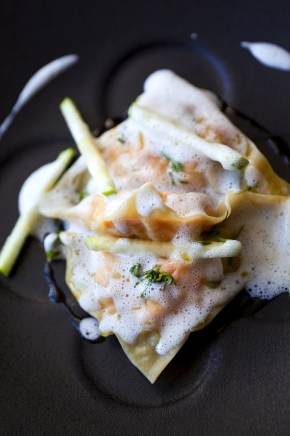 Tagliate le mele verdi a julienne e irroratele con il succo di limone. In una padella fate saltare il salmone affumicato con un cucchiaio di olio e le mele sgocciolate, aggiungete la panna e cuocete a fiamma bassa per 3 minuti. Scolate i ravioli al dente e condite con la crema di salmone amalgamando bene. Quindi servite guarnendo con uova di salmone.