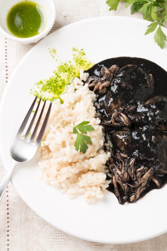 Pulite le seppie, mettendo da parte i sacchetti che contengono il nero e tagliatele a pezzetti sottilissimi. tritate finemente una cipolla e soffriggetela, a fuoco medio, assieme allo spicchio d'aglio schiacciato. aggiungete il concentrato di pomodoro, le sacche del nero ed i pezzettini di seppia. salate e fate cuocere per circa quaranta minuti fino ad ottenere una salsa densa, nera e bordata di rosso. intanto a parte, fate soffriggere in olio, un'altra cipolla tritata, senza farla dorare. aggiungete il riso e mescolando, bagnate con il mezzo bicchiere di vino, facendolo evaporare. unite un mestolo d'acqua e fate cuocere per dieci minuti circa, facendo attenzione che il riso non si attacchi. unite a questo punto la salsa con il nero di seppia e portate a termine la cottura, rimescolando sempre ed aggiungendo, di tanto in tanto, un poco d'acqua. sistemate il riso a forma di cono su un piatto di portata e decoratelo con la ricotta mischiata alla salsa di pomodoro e al parmigiano per simulare le colate di lava. spolverate infine con il prezzemolo tritato.