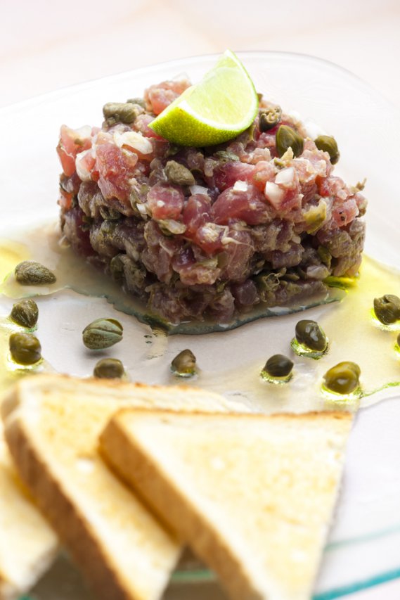 Taglia la polpa di tonno a dadini molto piccoli, disponila in una ciotola e bagnala con il succo di mezzo limone. Ripeti l'operazione con la polpa di salmone. A parte, mescola in una ciotola capiente il pomodoro tagliato a dadini, il cipollotto tritato finemente e il coriandolo sminuzzato. Unisci metà del composto di pomodori nella ciotola del tonno e metà in quella del salmone. mescola bene. Condisci ciascun pesce con un filo di olio d'oliva, quindi sala e pepa. Versa ciascuna tartare in una formina o ciotolina, quindi sforma sul piatto di portata e servi subito. Decora a piacere con qualche fettina di avocado.
