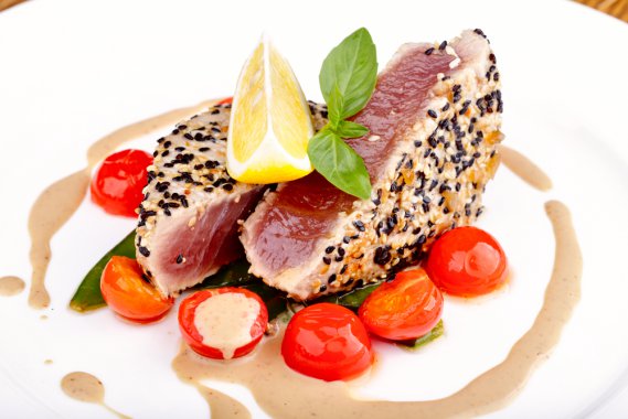 Dividi ogni trancio di tonno in quattro parti e passali nei semini di sesamo per panarli. Con le mani fai aderire bene i semi alla polpa del tonno e conservalo in frigorifero per circa 20 minuti. Lava la rucola e asciugala con la centrifuga o tamponandola con un telo. Lava i pomodori, tagliali, elimina i semi e falli a dadini. Condiscili con olio, lo spicchio d'aglio tritato, il basilico spezzettato, il limone e un po' di sale e peperoncino. gira il tutto e conserva in frigorifero. Friggi velocemente i tranci di tonno impanati in abbondante olio, falli sgocciolare su carta assorbente e condiscili con un pizzico di sale. Distribuisci la rucola su quattro piatti e disponici sopra i tranci di tonno fritti. Servili accompagnati alla salsa di pomodoro che hai preparato mettendola in quattro coppette separate o al lato dello stesso piatto.