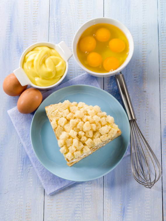 Prepara il pan di spagna. Monta le uova e lo zucchero con le fruste elettriche, incorpora 200 g di farina e il lievito, versalo in una tortiera imburrata e infarinata e cuoci nel forno già caldo a 160°c per 30 minuti. Prepara la crema, lavora i tuorli con lo zucchero, aggiungi la farina e mescola. Bolli a parte il latte con la scorza di limone, uniscilo, filtrandolo in un passino, al composto di tuorli e mettilo sul fuoco, mescolando continuamente. Togli la crema dal fuoco appena inizia a bollire, mescolala e rimettila sul fuoco ripetendo 3 volte l’operazione. Lascia raffreddare e incorpora la panna montata. Taglia il pan di spagna in 3 dischi uguali, dividine uno a cubetti e tienili da parte; spennella un altro disco con un poco di liquore, distribuisci sopra uno strato uniforme di crema, coprila con il disco rimasto e spennella anche questo con il liquore. Ricopri infine con la crema rimasta. Distribuisci sulla superficie del dolce i cubetti di pan di spagna tenuti da parte, spolverizzali con lo zucchero a velo e servi.