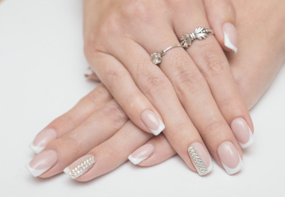 1. La french manicure – Non è una french classica, ma più una manicure nude 2.0, che lascia l'unghia semplice e pulita, evidenziando la lunetta con lo smalto bianco, ma inserendo cristalli e decori tono su tono (foto di copertina) sull'unghia.