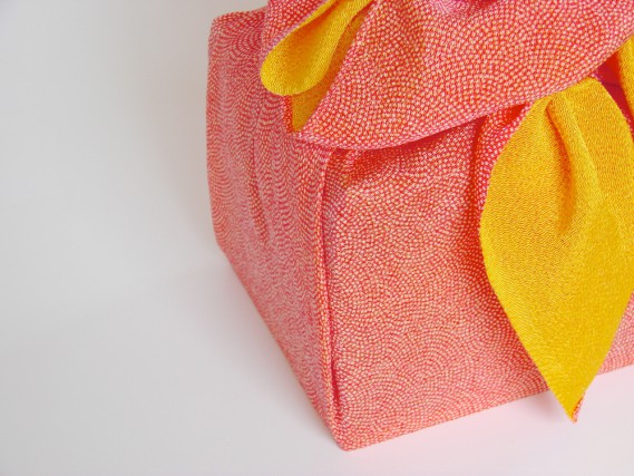 Armarsi di un pezzo di stoffa di seta quadrato o di un foulard che possa essere usato una volta che sarà concluso il Natale. Sistemare il panettone al centro e mettere il quadrato di tessuto sul ripiano da lavoro come fosse un rombo: prendere un lembo di stoffa e il suo lembo opposto e annodare al top. Poi prendere gli altri due lembi passarli sotto il nodo, uno sovrapposto all’altro, e fare un nuovo nodo. Infine allargare e stendere bene le estremità dei nodi a formare una sorta di coccarda. La tecnica furoshiki è di grande effetto.