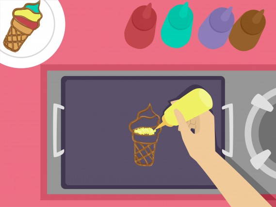 Con l’olio, fai una pulita su una padella o la piastra antiaderente, tieni il fuoco basso. A questo punto, puoi realizzare il tuo disegno con la pancake art: come si vede nei video tutorial in basso, disegna il contorno e riempi le figure con le varie sfumature.