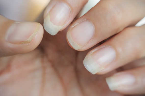 - Unghie che si dividono: quando sono indebolite, potrebbero dividersi. Questo è noto come Onychoschizia o scissione e può essere associato a frequenti lavaggi delle mani, clima freddo / secco, smalti vecchi, colle acriliche e solventi come acetone.