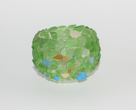 1) Rivesti un vaso, una ciotola, un barattolo che hai già incollando i vetrini di mare con una colla idonea ai materiali, ad esempio con la colla vinilica, la colla a caldo, la resina epossidica;
